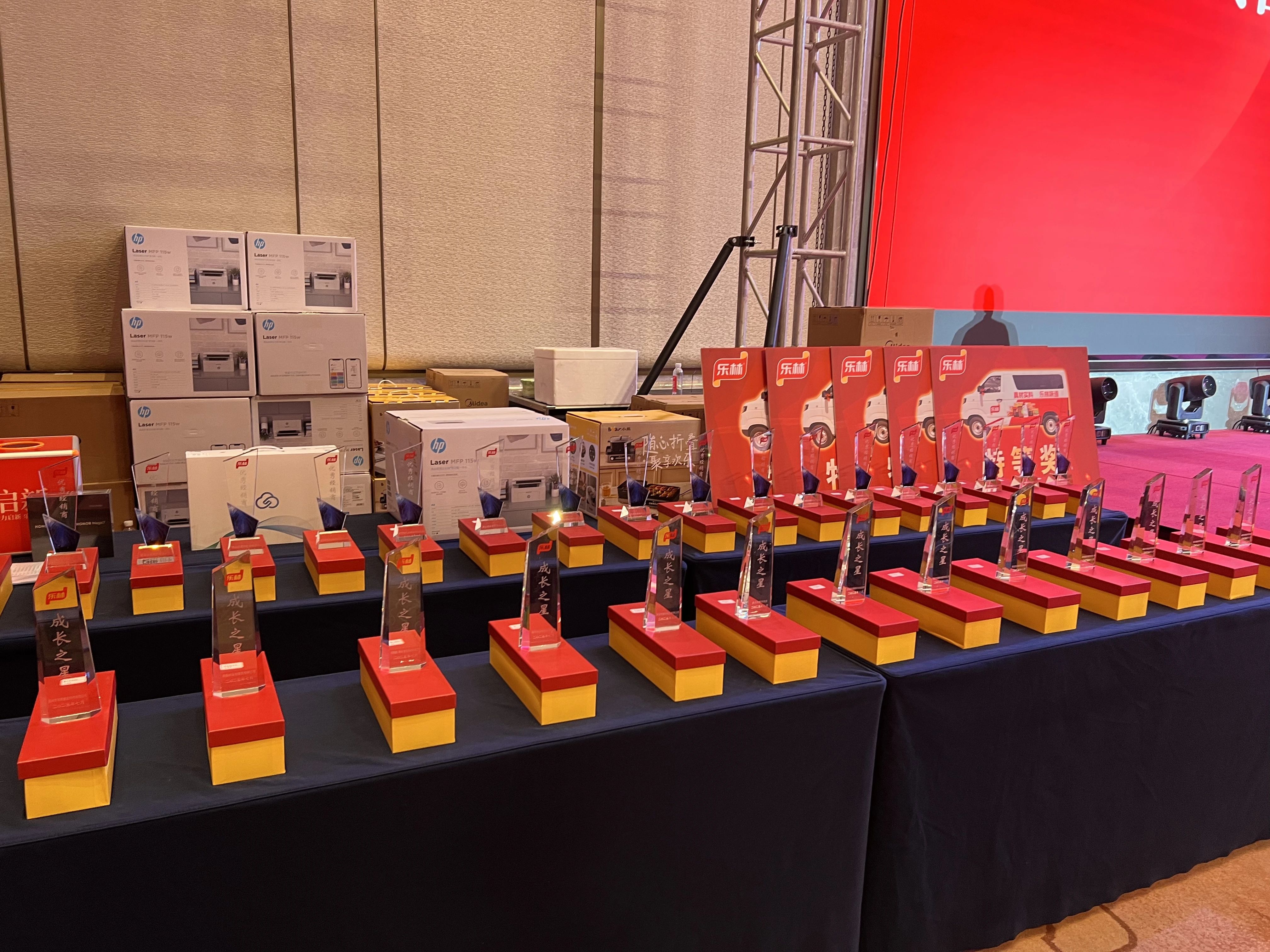 樂林大區經理王澤喜先生,詳細介紹了樂林六大產品系列及近年新品與未來規劃,打款政策宣講緊隨其后,手機筆記本商用電車等眾多獎品,點燃全場熱情。大會迎來情感沸點——年度頒獎,“成長獎”是銳意進取的新銳力量;“優秀獎”是走向全國市場的中流砥柱;“卓越貢獻獎”則是對風雨同舟、業績卓著伙伴的最高禮贊。